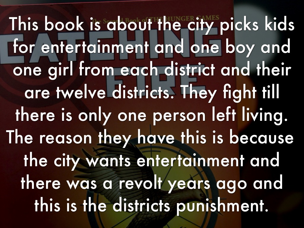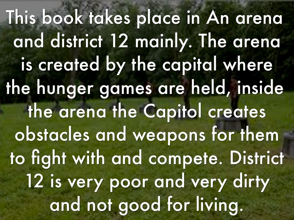 This book takes place in An arena and district 12 mainly. The arena is created by the capital where the hunger games are held, inside the arena the Capitol creates obstacles and weapons for them to fight with and compete. District 12 is very poor and very dirty and not good for living.