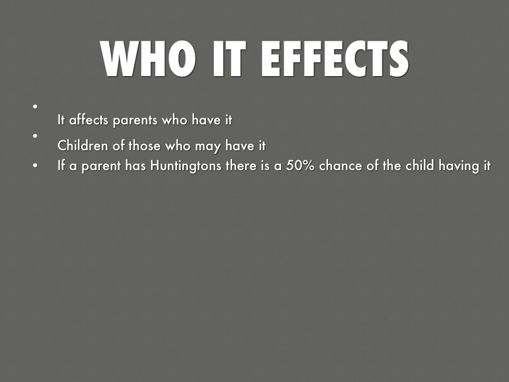 If a parent has Huntingtons there is a 50% chance of the child having it