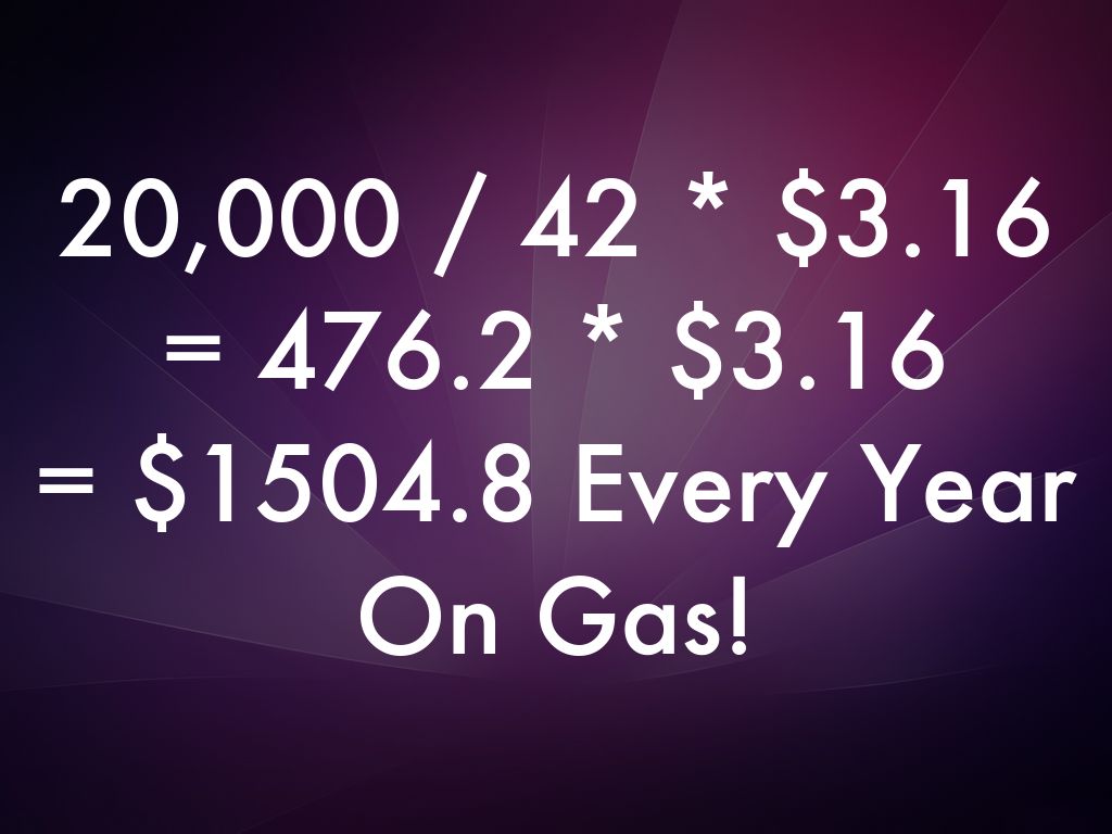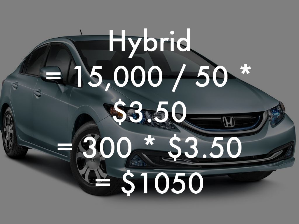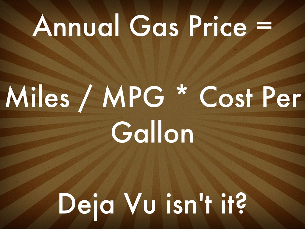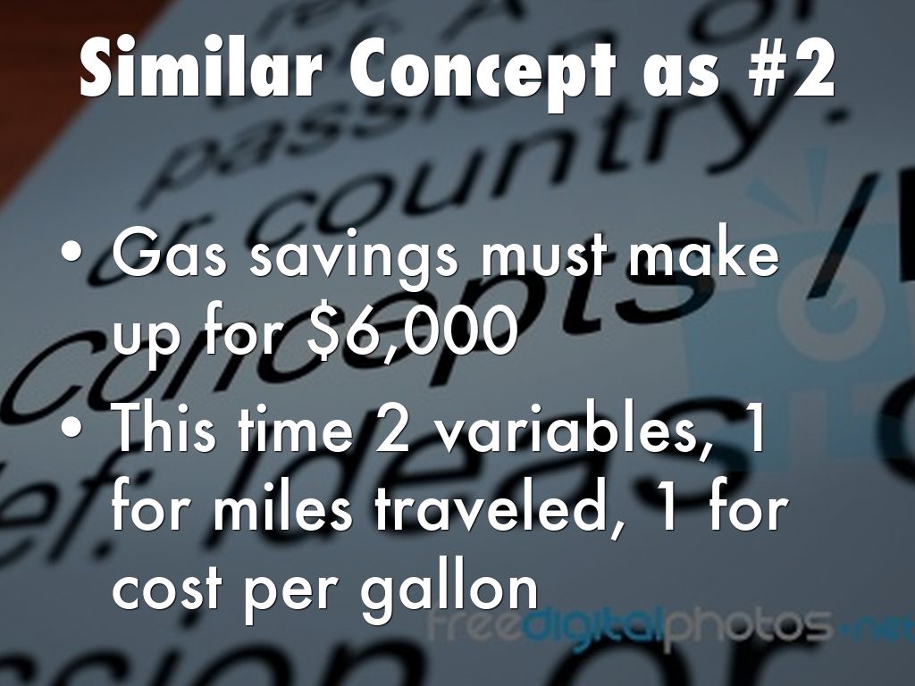 • This time 2 variables, 1 for miles traveled, 1 for cost per gallon