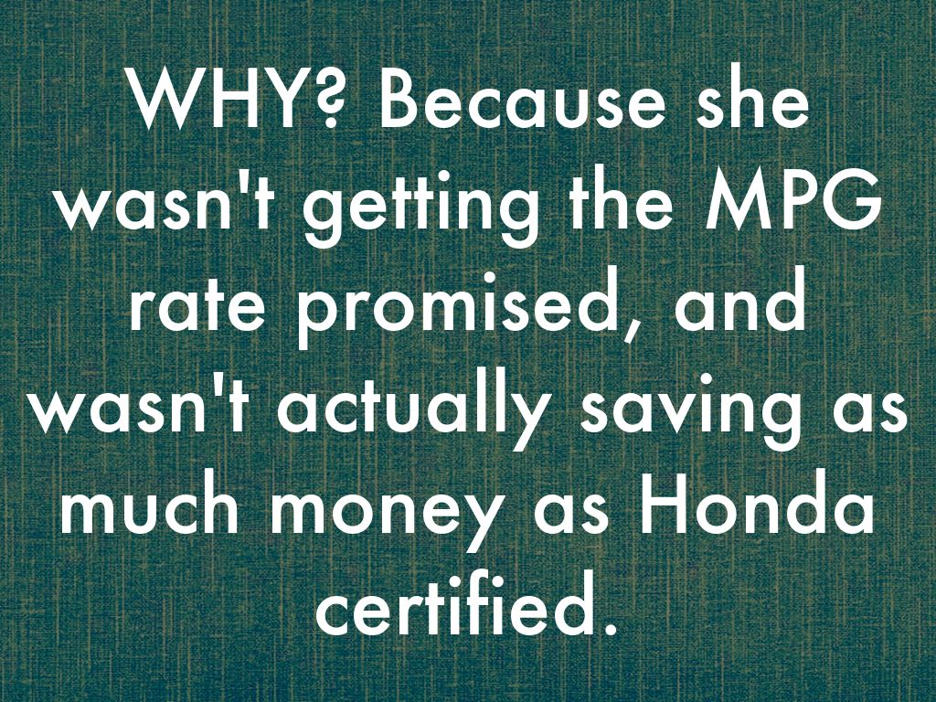 WHY? Because she wasn't getting the MPG rate promised, and wasn't actually saving as much money as Honda certified.
