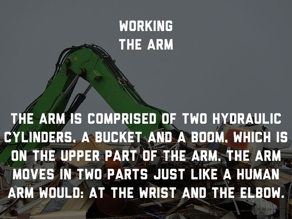The arm is comprised of two hydraulic cylinders, a bucket and a boom, which is on the upper part of the arm. The arm moves in two parts just like a human arm would: at the wrist and the elbow.