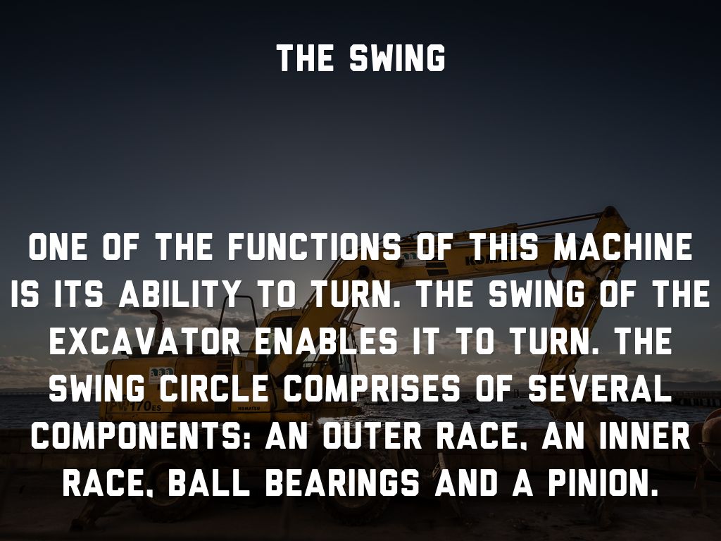 One of the functions of this machine is its ability to turn. The swing of the excavator enables it to turn. The swing circle comprises of several components: an outer race, an inner race, ball bearings and a pinion.