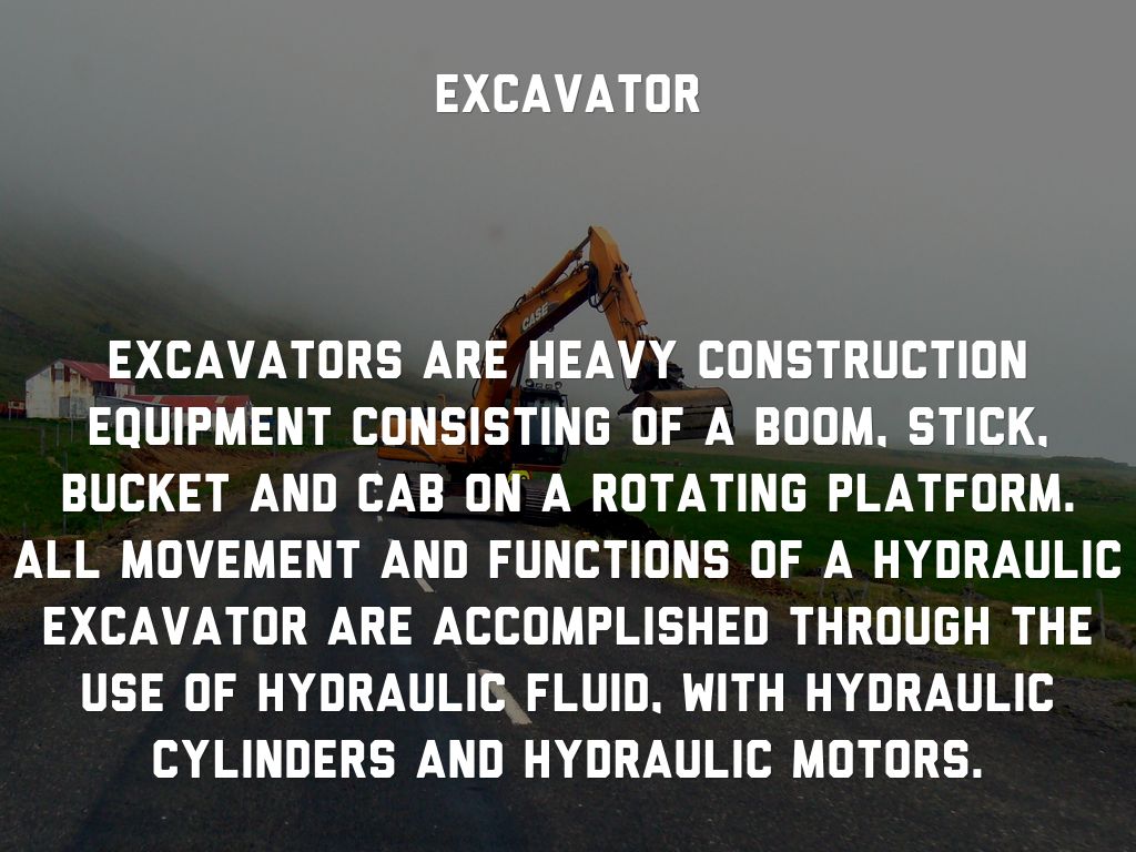 Excavators are heavy construction equipment consisting of a boom, stick, bucket and cab on a rotating platform. All movement and functions of a hydraulic excavator are accomplished through the use of hydraulic fluid, with hydraulic cylinders and hydraulic motors.