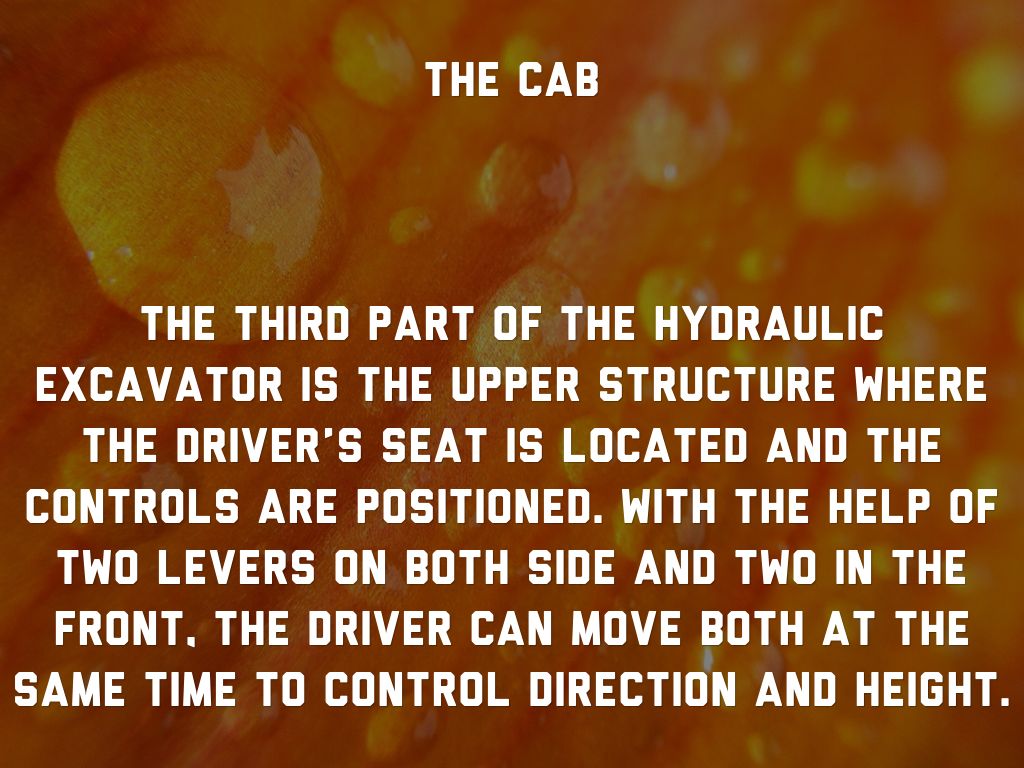 The third part of the hydraulic excavator is the upper structure where the driver’s seat is located and the controls are positioned. With the help of two levers on both side and two in the front, the driver can move both at the same time to control direction and height.