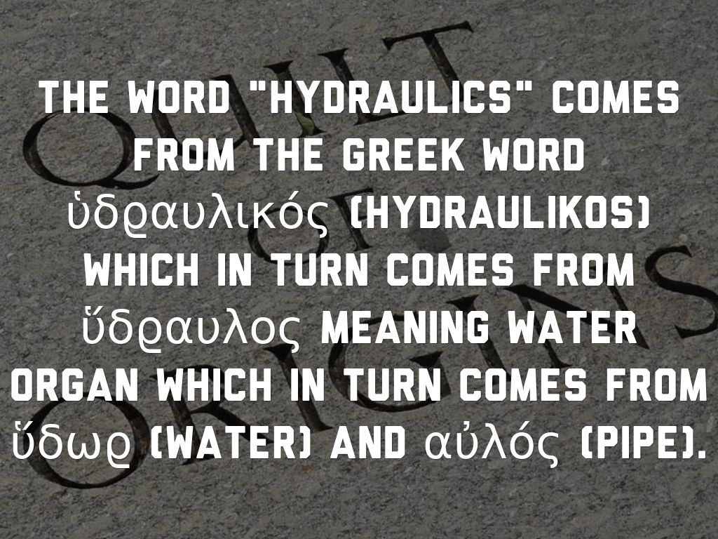 The word "hydraulics" comes from the Greek word ὑδϱαυλικός (hydraulikos) which in turn comes from ὕδϱαυλος meaning water organ which in turn comes from ὕδωϱ (water) and αὐλός (pipe).