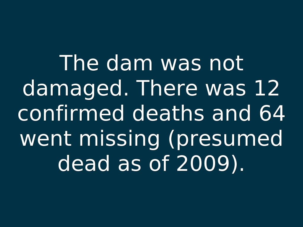 The dam was not damaged. There was 12 confirmed deaths and 64 went missing (presumed dead as of 2009).