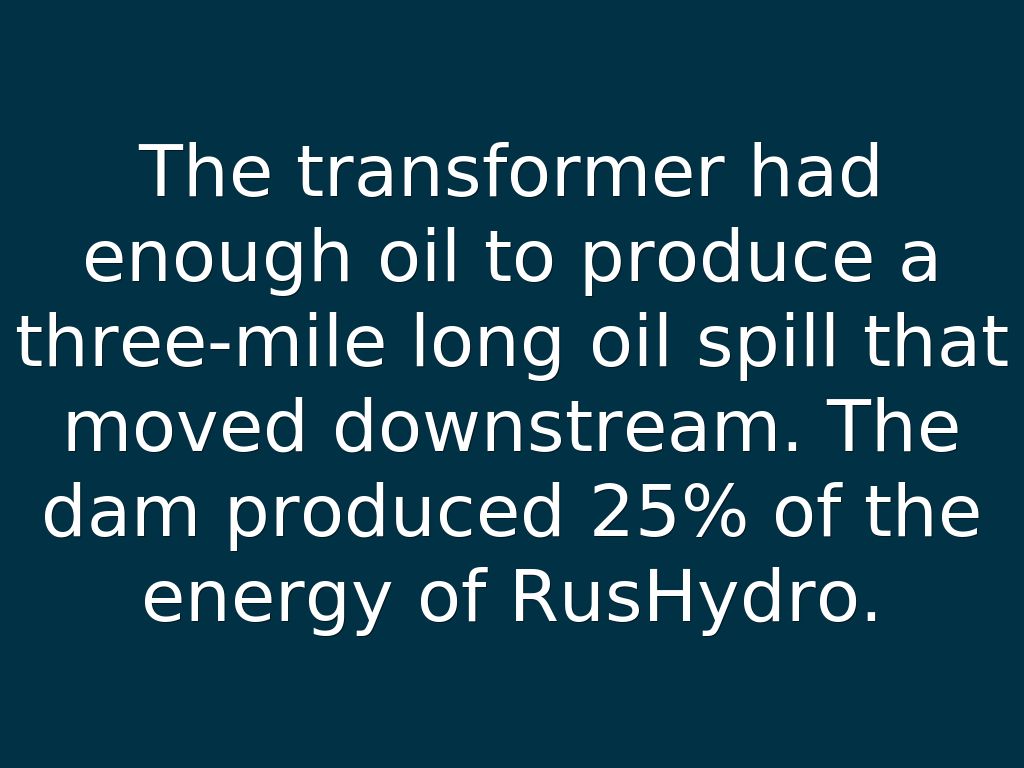 The transformer had enough oil to produce a three-mile long oil spill that moved downstream. The dam produced 25% of the energy of RusHydro.