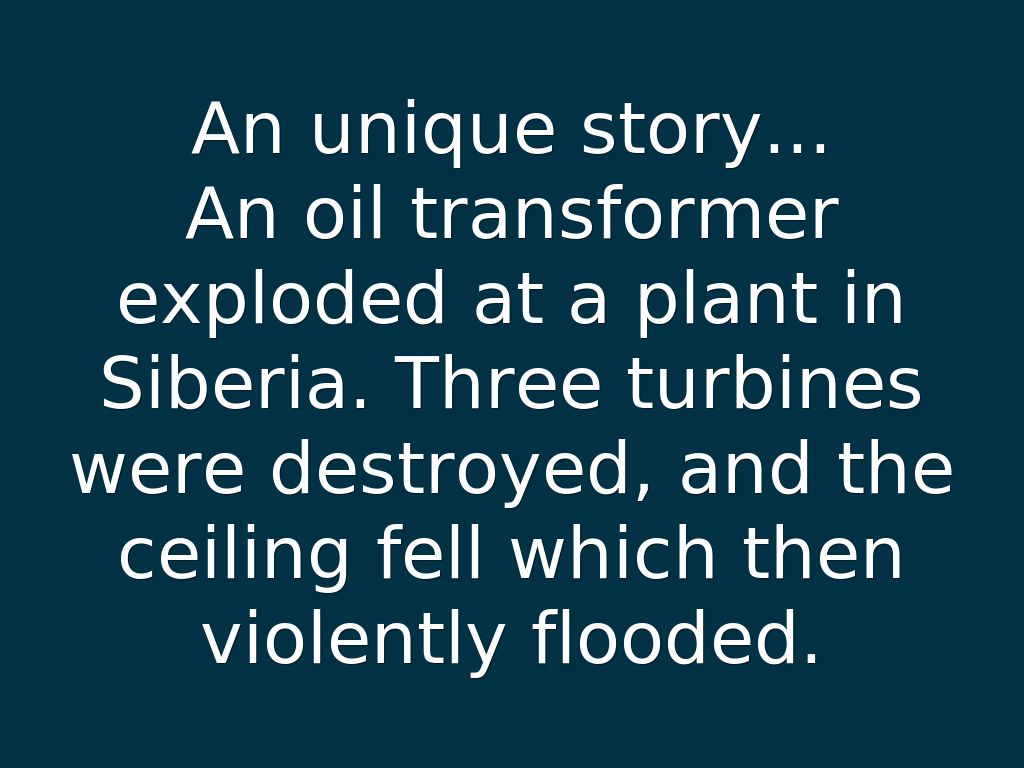 An oil transformer exploded at a plant in Siberia. Three turbines were destroyed, and the ceiling fell which then violently flooded.