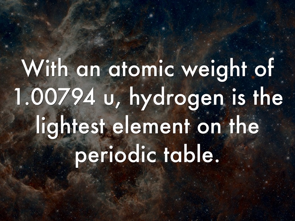 With an atomic weight of 1.00794 u, hydrogen is the lightest element on the periodic table.