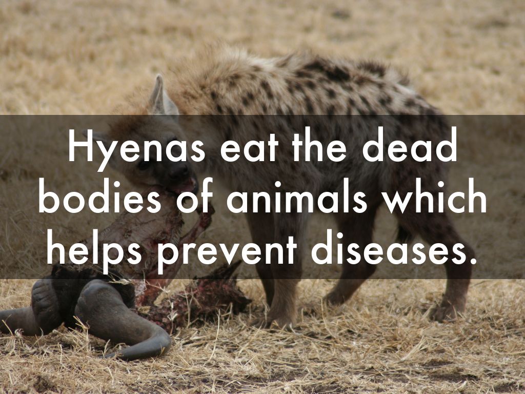 Hyenas eat the dead bodies of animals which helps prevent diseases.
