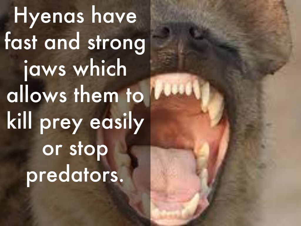 Hyenas have fast and strong jaws which allows them to kill prey easily or stop predators.