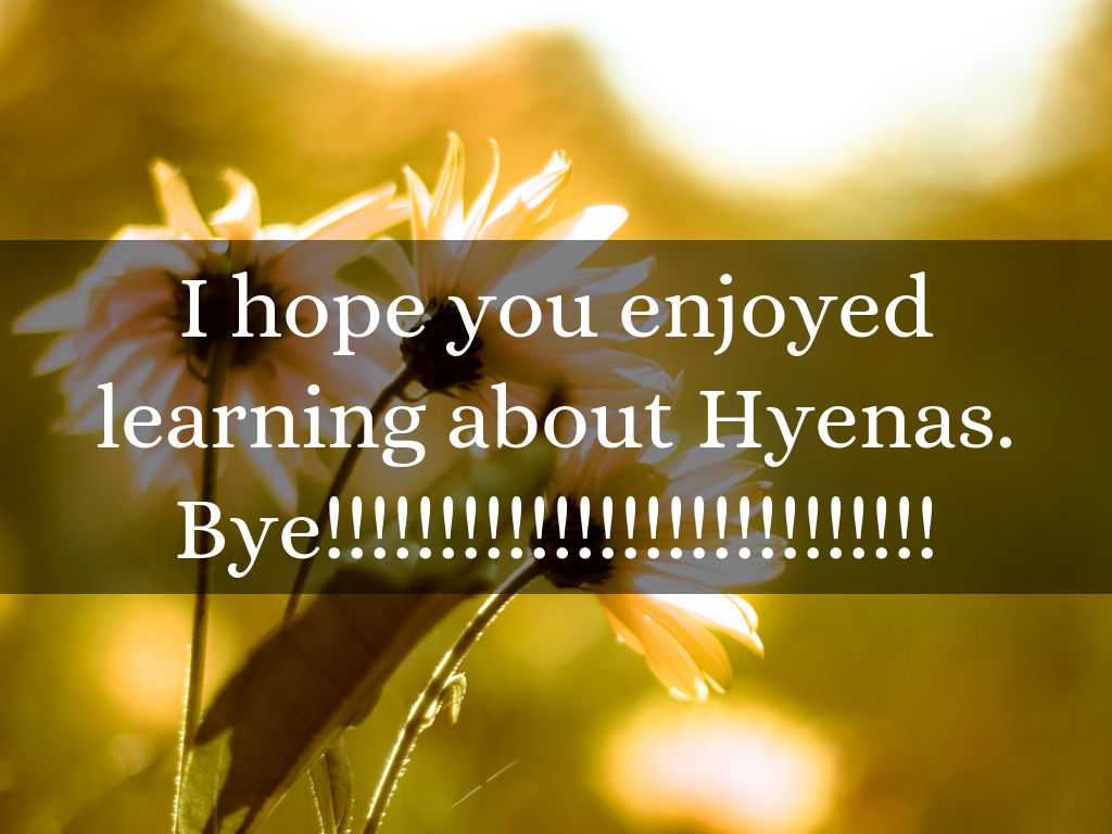 I hope you enjoyed learning about Hyenas. Bye!!!!!!!!!!!!!!!!!!!!!!!!!!!