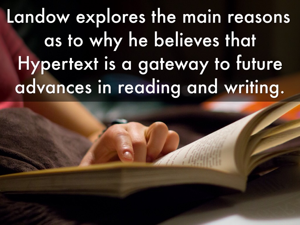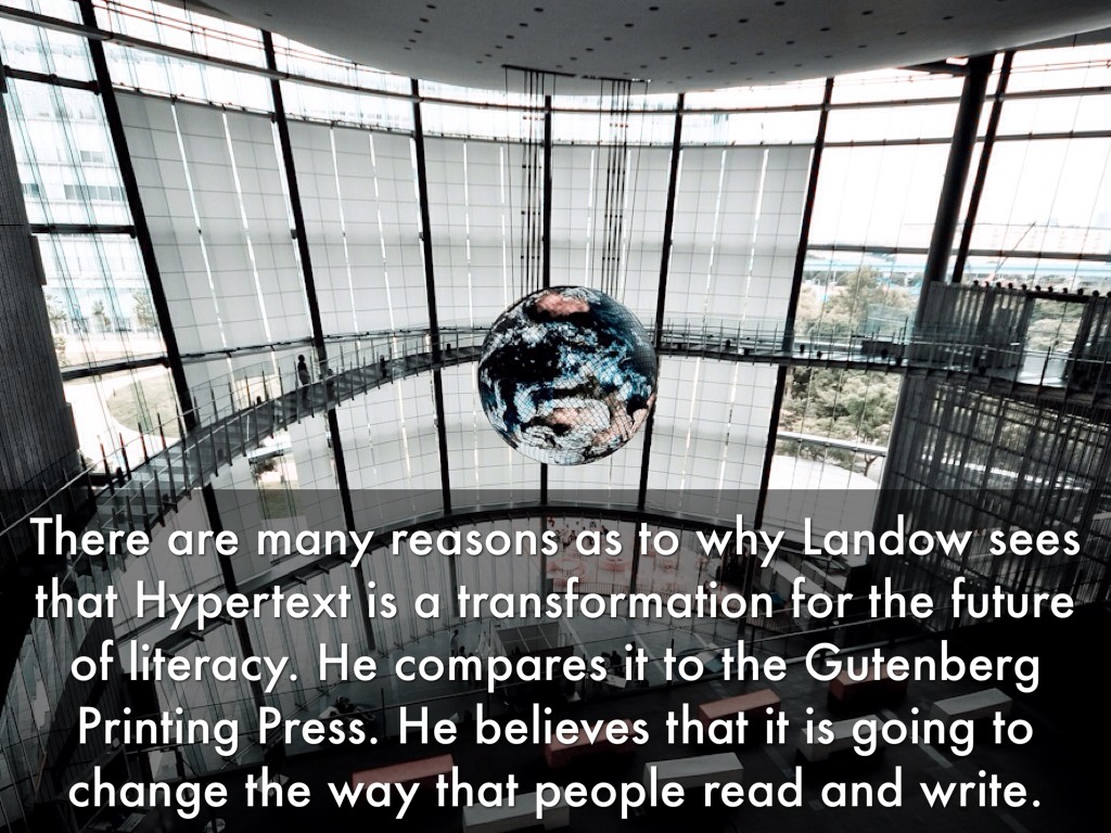 There are many reasons as to why Landow sees that Hypertext is a transformation for the future of literacy. He compares it to the Gutenberg Printing Press. He believes that it is going to change the way that people read and write.