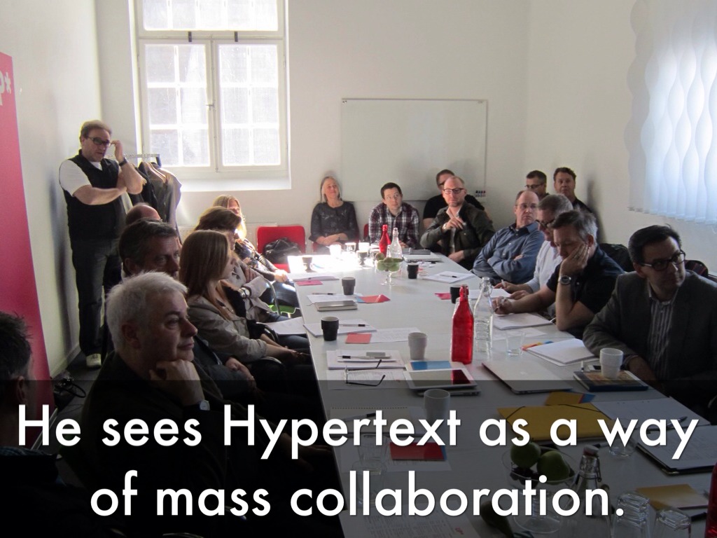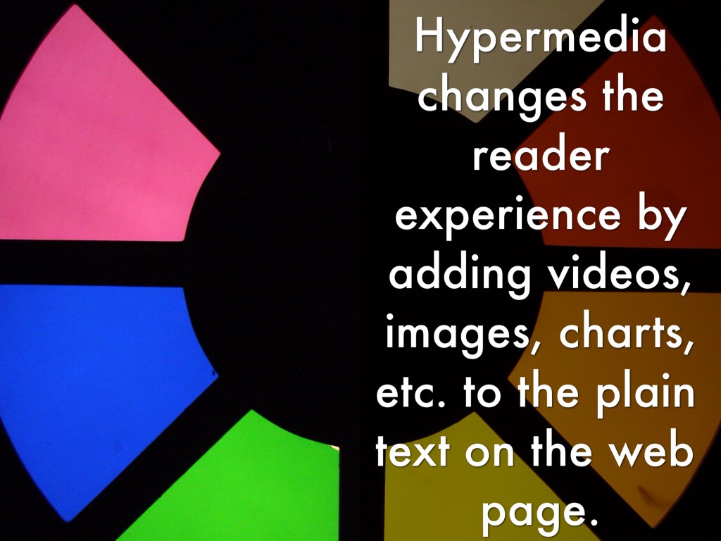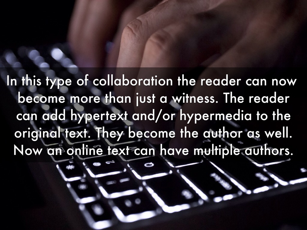 In this type of collaboration the reader can now become more than just a witness. The reader can add hypertext and/or hypermedia to the original text. They become the author as well. Now an online text can have multiple authors.