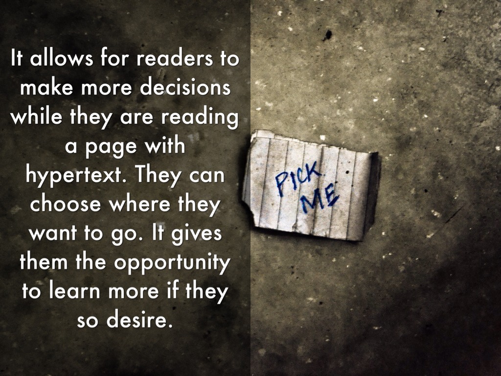 It allows for readers to make more decisions while they are reading a page with hypertext. They can choose where they want to go. It gives them the opportunity to learn more if they so desire.