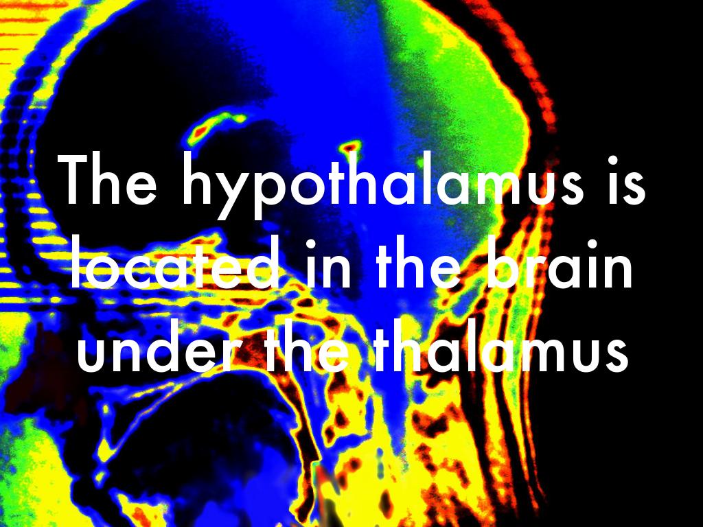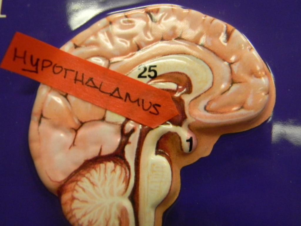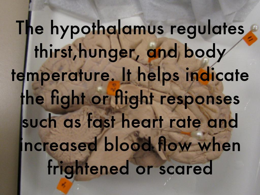 The hypothalamus regulates thirst,hunger, and body temperature. It helps indicate the fight or flight responses such as fast heart rate and increased blood flow when frightened or scared