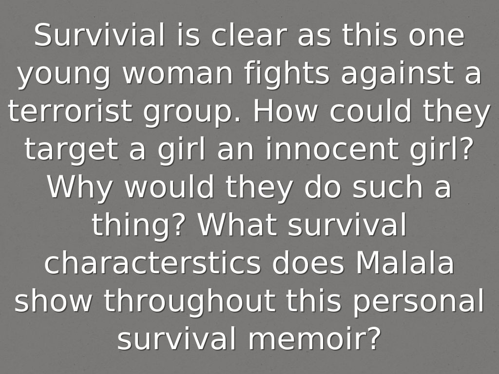 Survivial is clear as this one young woman fights against a terrorist group. How could they target a girl an innocent girl? Why would they do such a thing? What survival characterstics does Malala show throughout this personal survival memoir?
