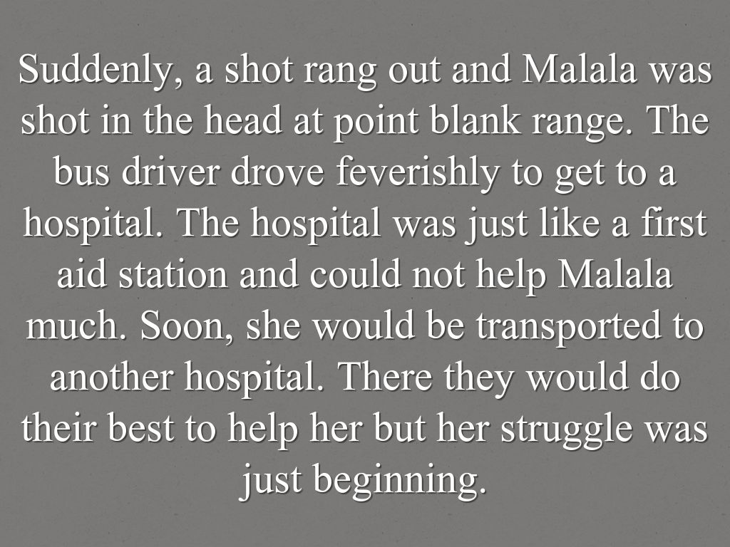 Suddenly, a shot rang out and Malala was shot in the head at point blank range. The bus driver drove feverishly to get to a hospital. The hospital was just like a first aid station and could not help Malala much. Soon, she would be transported to another hospital. There they would do their best to help her but her struggle was just beginning.