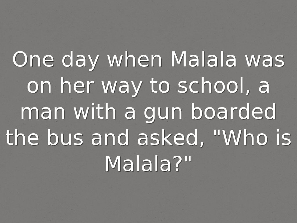 One day when Malala was on her way to school, a man with a gun boarded the bus and asked, "Who is Malala?"