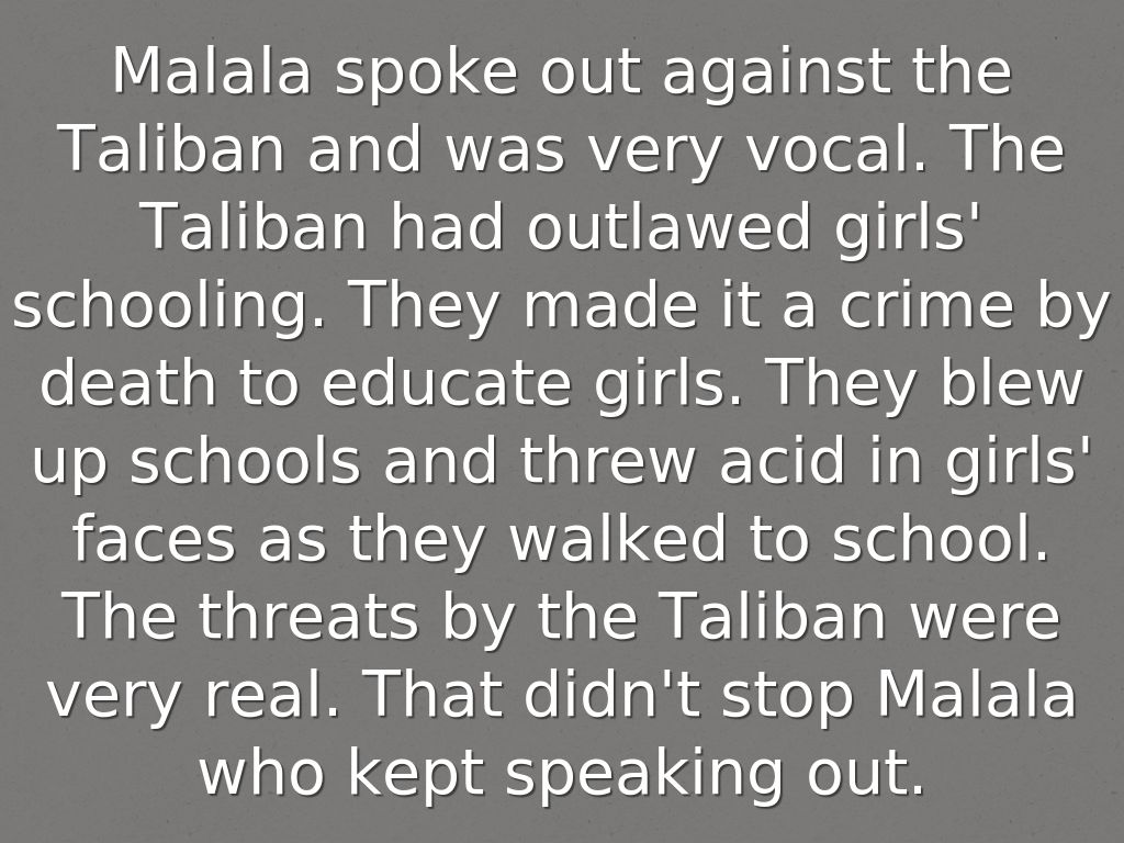 Malala spoke out against the Taliban and was very vocal. The Taliban had outlawed girls' schooling. They made it a crime by death to educate girls. They blew up schools and threw acid in girls' faces as they walked to school. The threats by the Taliban were very real. That didn't stop Malala who kept speaking out.