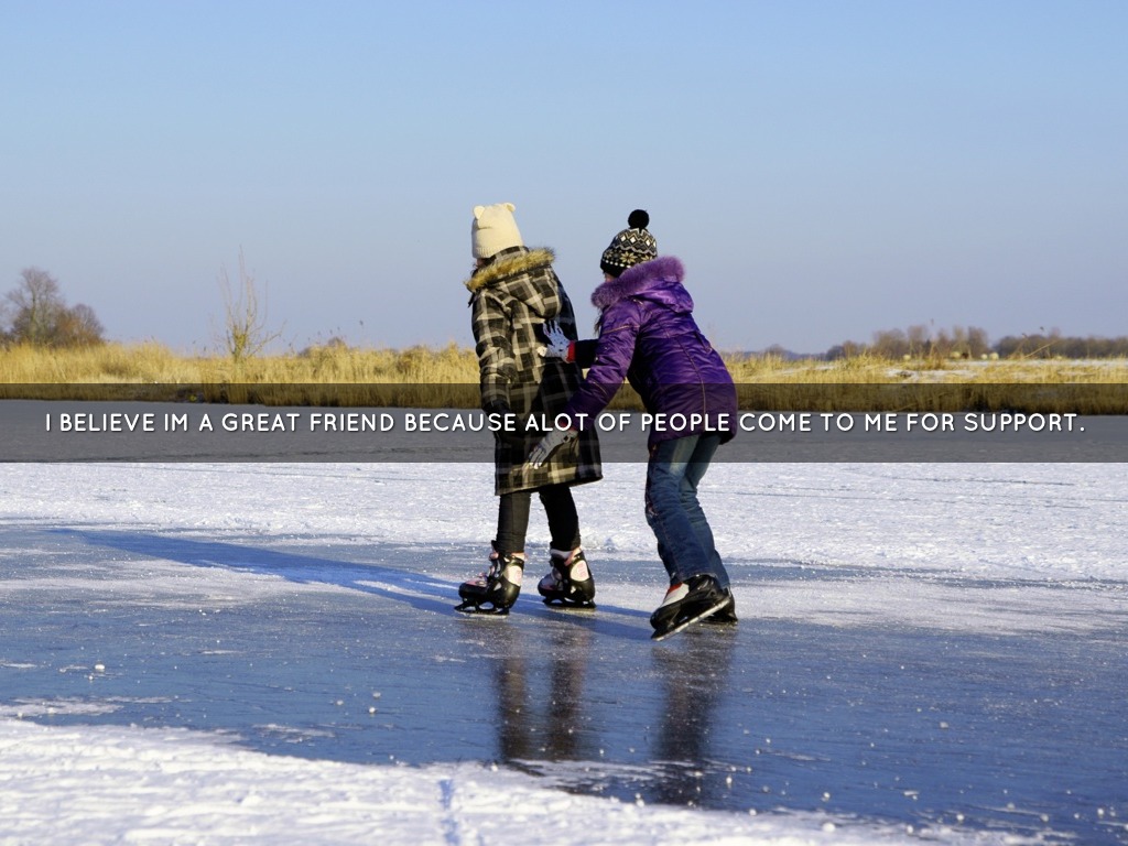 I BELIEVE IM A GREAT FRIEND BECAUSE ALOT OF PEOPLE COME TO ME FOR SUPPORT.