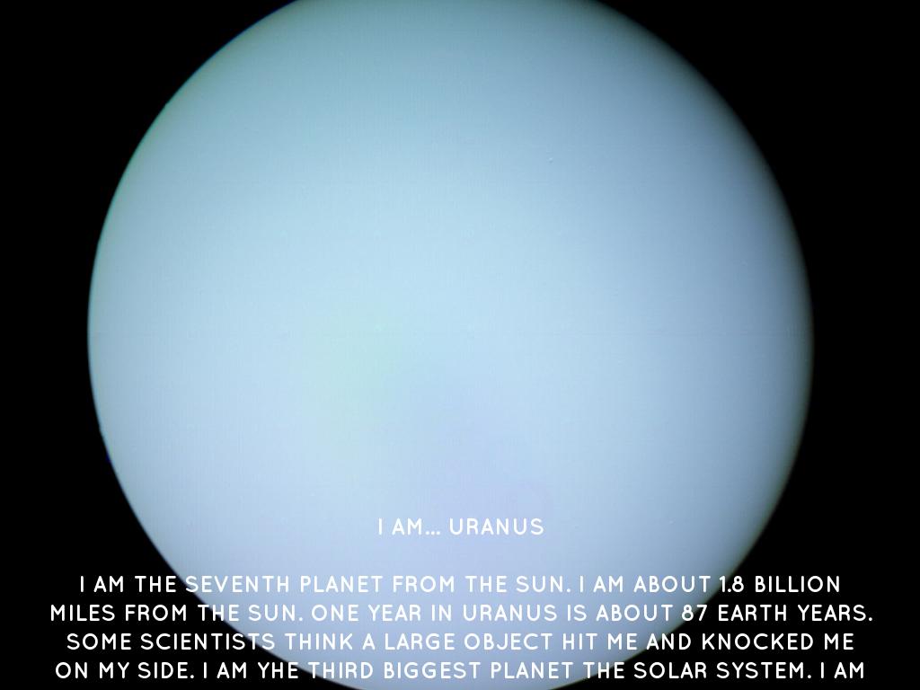 I AM THE SEVENTH PLANET FROM THE SUN. I AM ABOUT 1.8 BILLION MILES FROM THE SUN. ONE YEAR IN URANUS IS ABOUT 87 EARTH YEARS. SOME SCIENTISTS THINK A LARGE OBJECT HIT ME AND KNOCKED ME ON MY SIDE. I AM YHE THIRD BIGGEST PLANET THE SOLAR SYSTEM. I AM A COLD PLANET, THE TEMPERATURE HERE IS ABOUT -357 DEGREES FARENHITE.