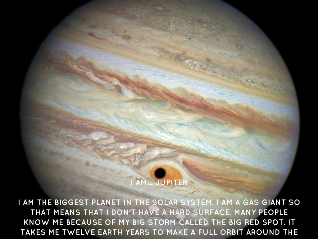 I AM THE BIGGEST PLANET IN THE SOLAR SYSTEM. I AM A GAS GIANT SO THAT MEANS THAT I DON’T HAVE A HARD SURFACE. MANY PEOPLE KNOW ME BECAUSE OF MY BIG STORM CALLED THE BIG RED SPOT. IT TAKES ME TWELVE EARTH YEARS TO MAKE A FULL ORBIT AROUND THE SUN, BUT ONE DAY HERE IS ONLY TEN EARTH HOURS. HERE THE TEMPERATURE IS VERY DIFFERENT THAN MOST OTHER PLANETS. IT CAN GET -250 AND 43,000 DEGREES FARENHITE.