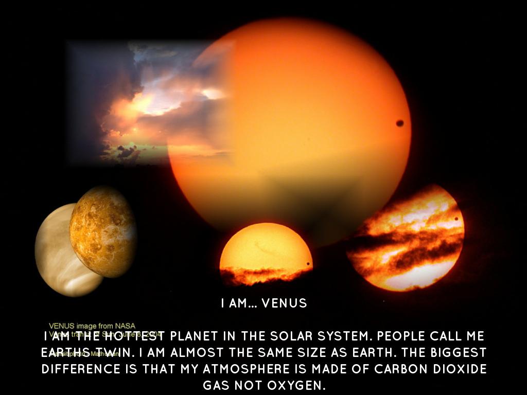 I AM THE HOTTEST PLANET IN THE SOLAR SYSTEM. PEOPLE CALL ME EARTHS TWIN. I AM ALMOST THE SAME SIZE AS EARTH. THE BIGGEST DIFFERENCE IS THAT MY ATMOSPHERE IS MADE OF CARBON DIOXIDE GAS NOT OXYGEN.