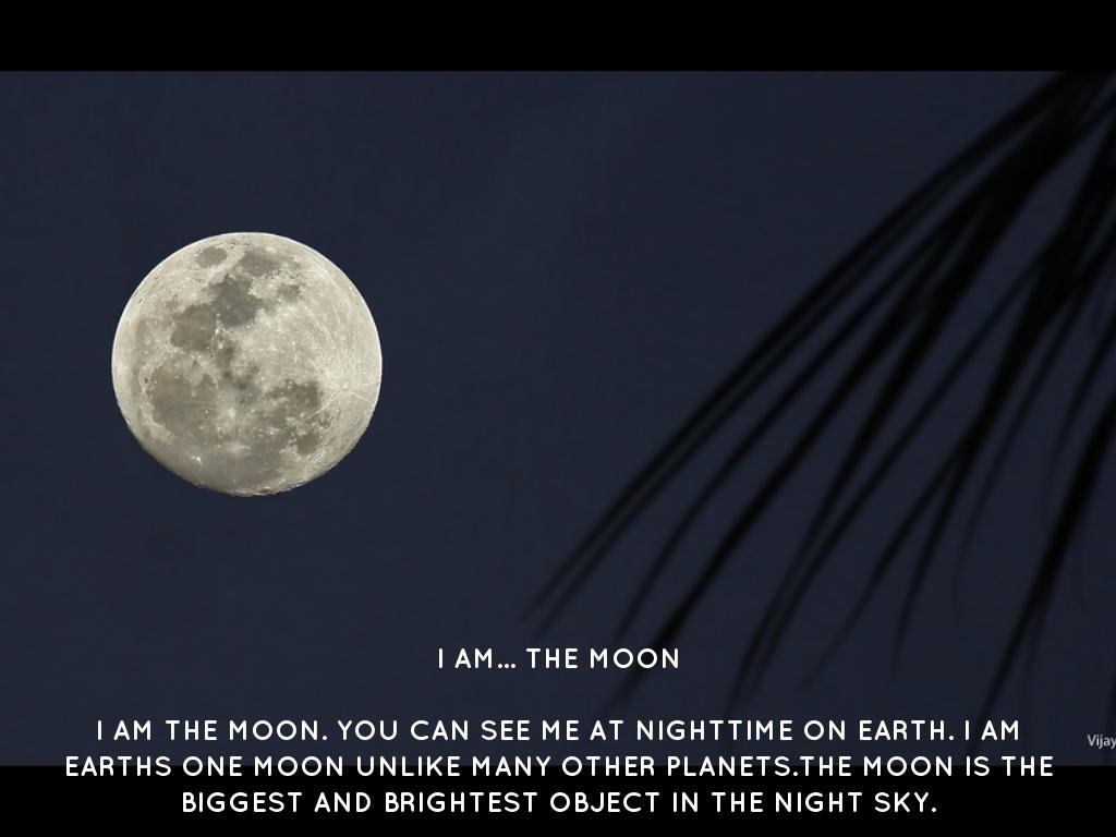 I AM THE MOON. YOU CAN SEE ME AT NIGHTTIME ON EARTH. I AM EARTHS ONE MOON UNLIKE MANY OTHER PLANETS.THE MOON IS THE BIGGEST AND BRIGHTEST OBJECT IN THE NIGHT SKY.