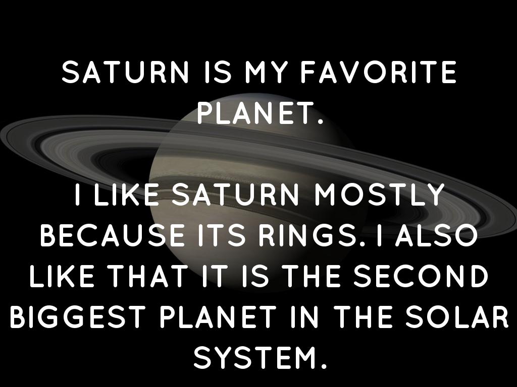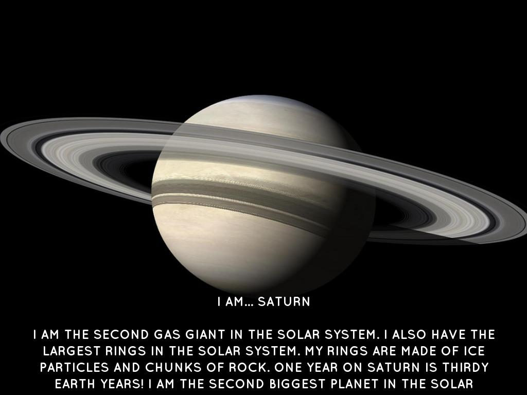 I AM THE SECOND GAS GIANT IN THE SOLAR SYSTEM. I ALSO HAVE THE LARGEST RINGS IN THE SOLAR SYSTEM. MY RINGS ARE MADE OF ICE PARTICLES AND CHUNKS OF ROCK. ONE YEAR ON SATURN IS THIRDY EARTH YEARS! I AM THE SECOND BIGGEST PLANET IN THE SOLAR SYSTEM.