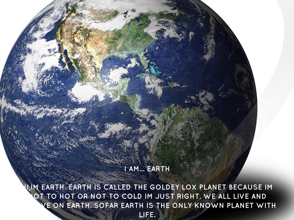 HI,IM EARTH. EARTH IS CALLED THE GOLDEY LOX PLANET BECAUSE IM NOT TO HOT OR NOT TO COLD IM JUST RIGHT. WE ALL LIVE AND SURVIVE ON EARTH. SOFAR EARTH IS THE ONLY KNOWN PLANET WITH LIFE.