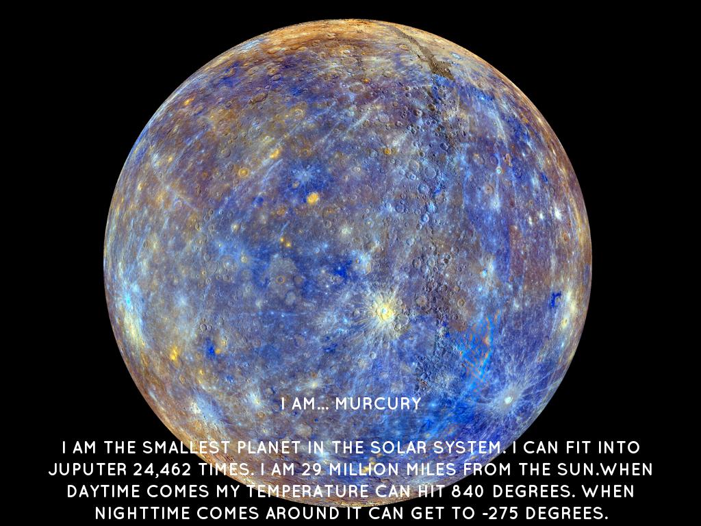I AM THE SMALLEST PLANET IN THE SOLAR SYSTEM. I CAN FIT INTO JUPUTER 24,462 TIMES. I AM 29 MILLION MILES FROM THE SUN.WHEN DAYTIME COMES MY TEMPERATURE CAN HIT 840 DEGREES. WHEN NIGHTTIME COMES AROUND IT CAN GET TO -275 DEGREES.