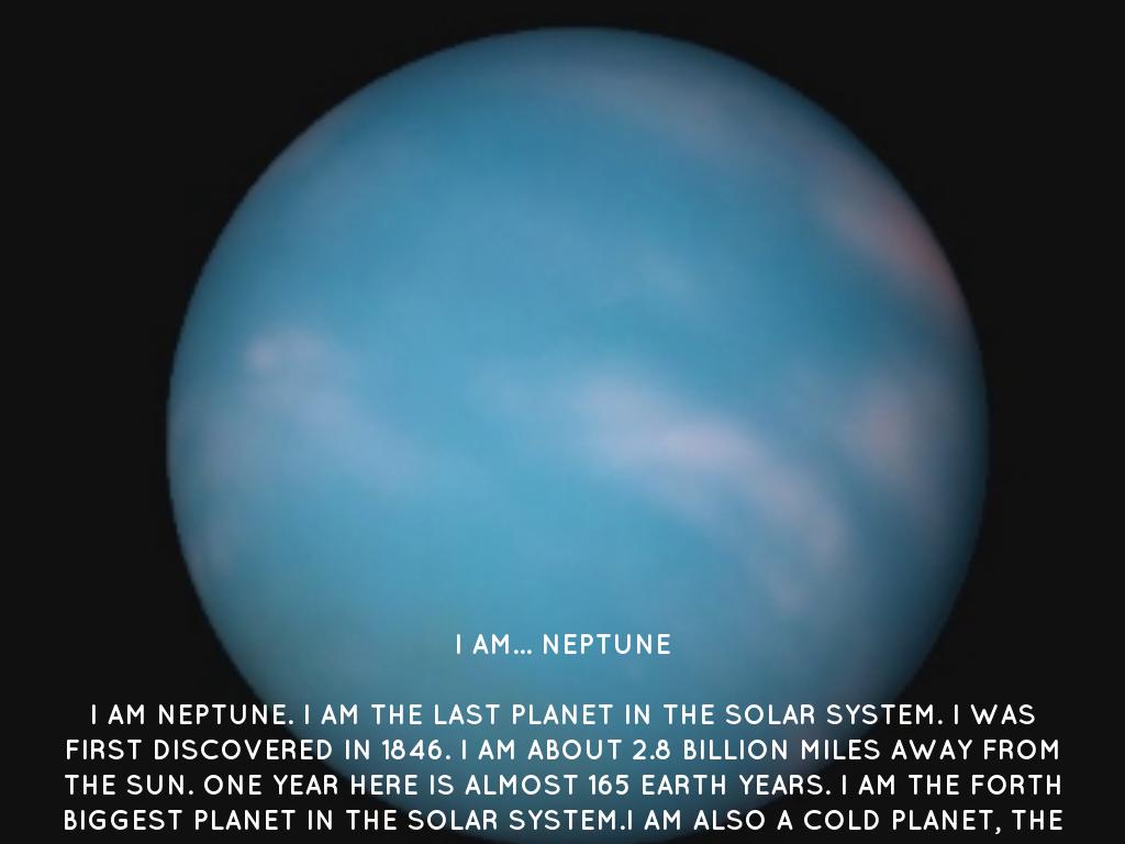 I AM NEPTUNE. I AM THE LAST PLANET IN THE SOLAR SYSTEM. I WAS FIRST DISCOVERED IN 1846. I AM ABOUT 2.8 BILLION MILES AWAY FROM THE SUN. ONE YEAR HERE IS ALMOST 165 EARTH YEARS. I AM THE FORTH BIGGEST PLANET IN THE SOLAR SYSTEM.I AM ALSO A COLD PLANET, THE AVERAGE TEMPERATURE HERE IS ABOUT -370 DEGREES FARENHITE.