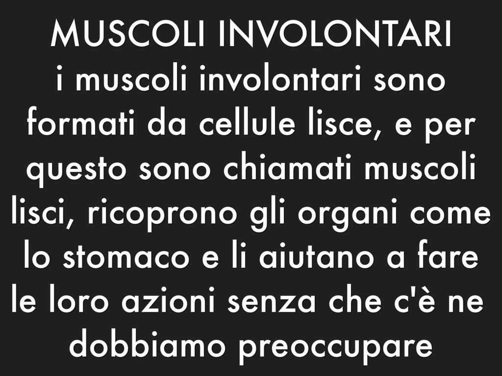 i muscoli involontari sono formati da cellule lisce, e per questo sono chiamati muscoli lisci, ricoprono gli organi come lo stomaco e li aiutano a fare le loro azioni senza che c'è ne dobbiamo preoccupare