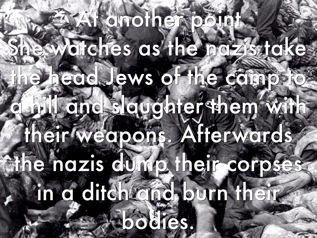 She watches as the nazis take the head Jews of the camp to a hill and slaughter them with their weapons. Afterwards the nazis dump their corpses in a ditch and burn their bodies.