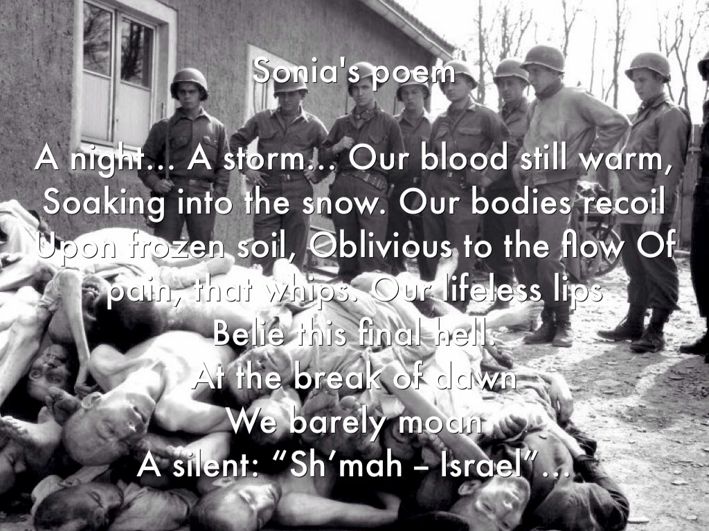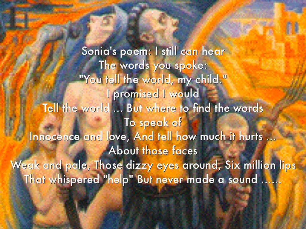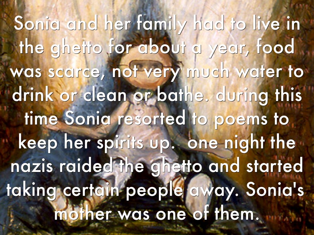 Sonia and her family had to live in the ghetto for about a year, food was scarce, not very much water to drink or clean or bathe. during this time Sonia resorted to poems to keep her spirits up. one night the nazis raided the ghetto and started taking certain people away. Sonia's mother was one of them.