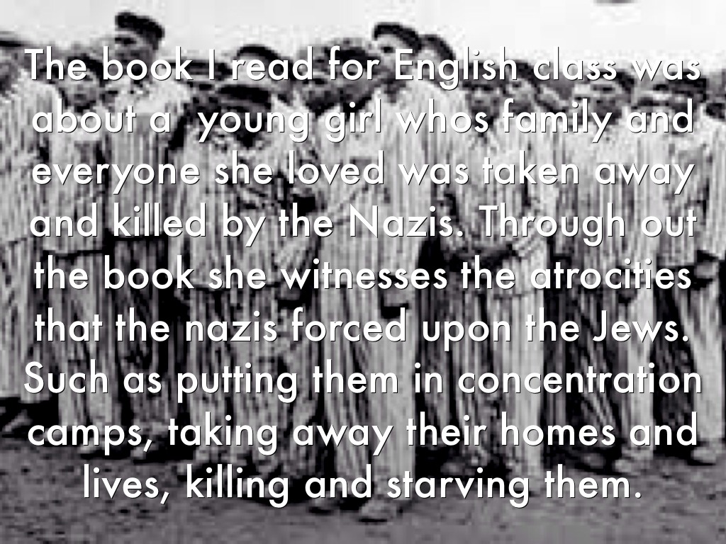 The book I read for English class was about a young girl whos family and everyone she loved was taken away and killed by the Nazis. Through out the book she witnesses the atrocities that the nazis forced upon the Jews. Such as putting them in concentration camps, taking away their homes and lives, killing and starving them.