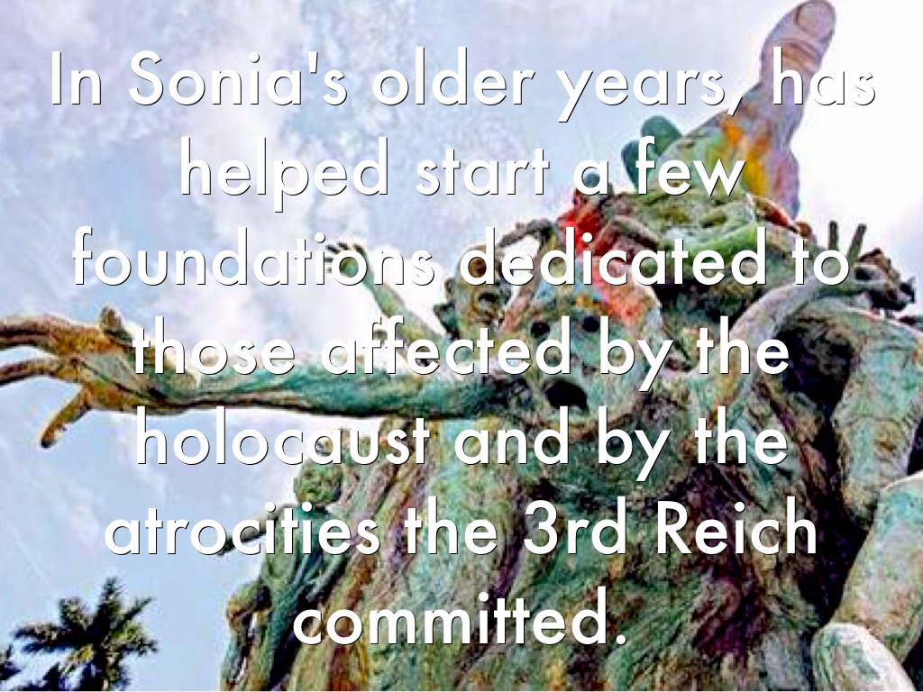 In Sonia's older years, has helped start a few foundations dedicated to those affected by the holocaust and by the atrocities the 3rd Reich committed.