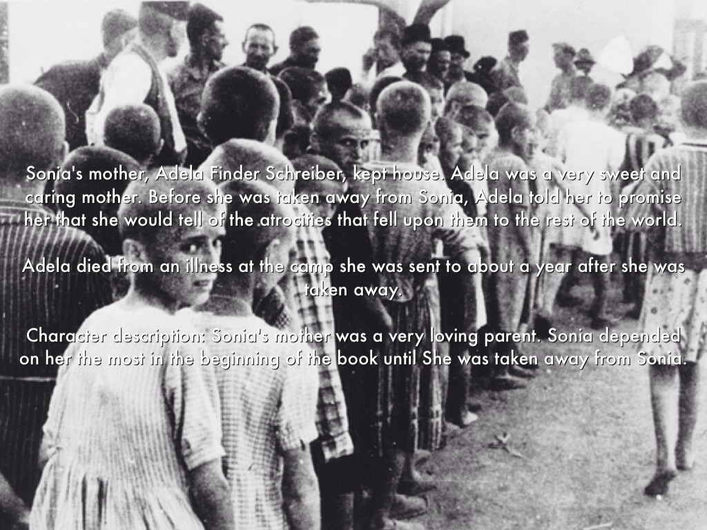 Sonia's mother, Adela Finder Schreiber, kept house. Adela was a very sweet and caring mother. Before she was taken away from Sonia, Adela told her to promise her that she would tell of the atrocities that fell upon them to the rest of the world.