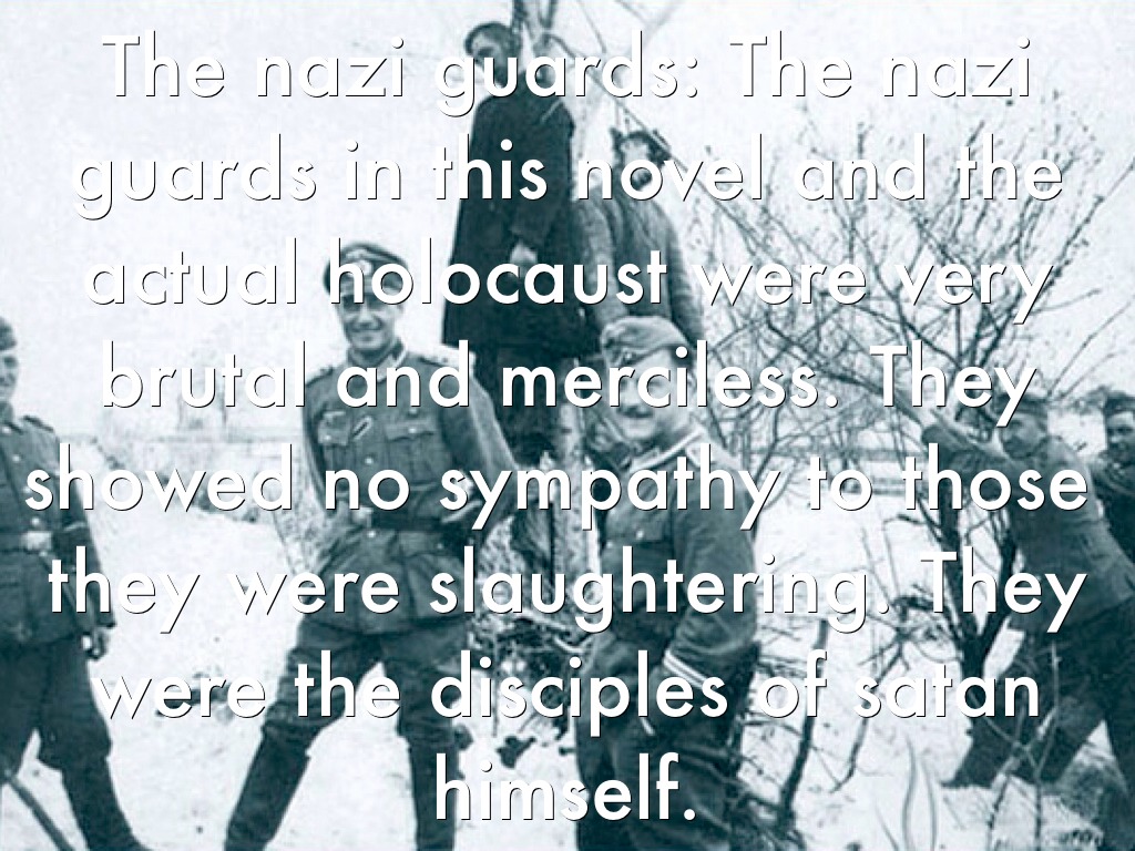 The nazi guards: The nazi guards in this novel and the actual holocaust were very brutal and merciless. They showed no sympathy to those they were slaughtering. They were the disciples of satan himself.
