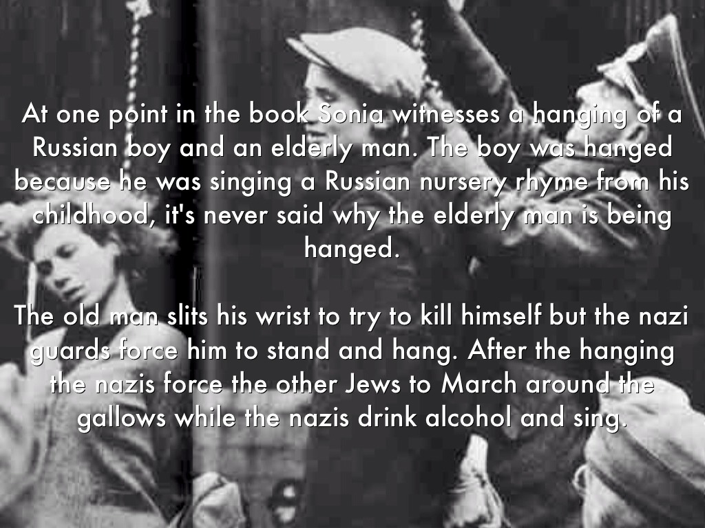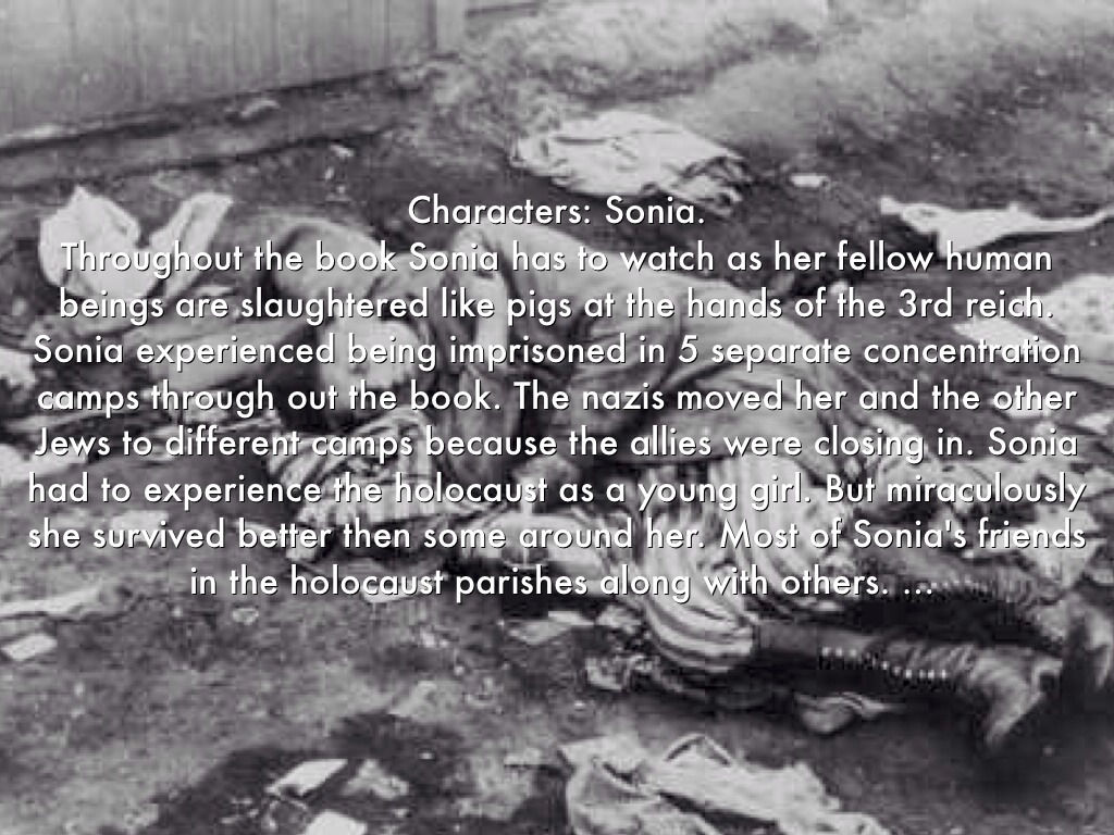 Throughout the book Sonia has to watch as her fellow human beings are slaughtered like pigs at the hands of the 3rd reich.