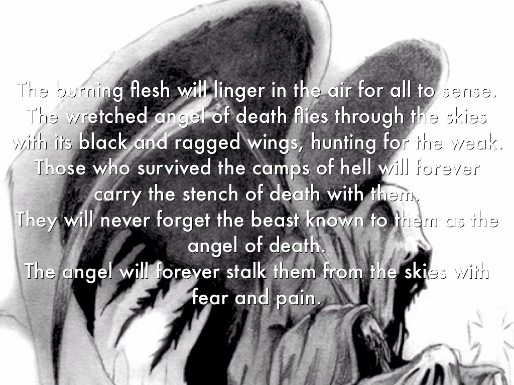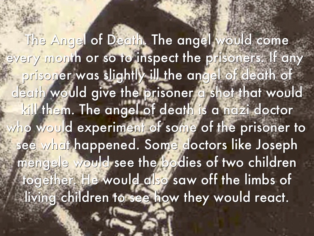 The Angel of Death. The angel would come every month or so to inspect the prisoners. If any prisoner was slightly ill the angel of death of death would give the prisoner a shot that would kill them. The angel of death is a nazi doctor who would experiment of some of the prisoner to see what happened. Some doctors like Joseph mengele would see the bodies of two children together. He would also saw off the limbs of living children to see how they would react.