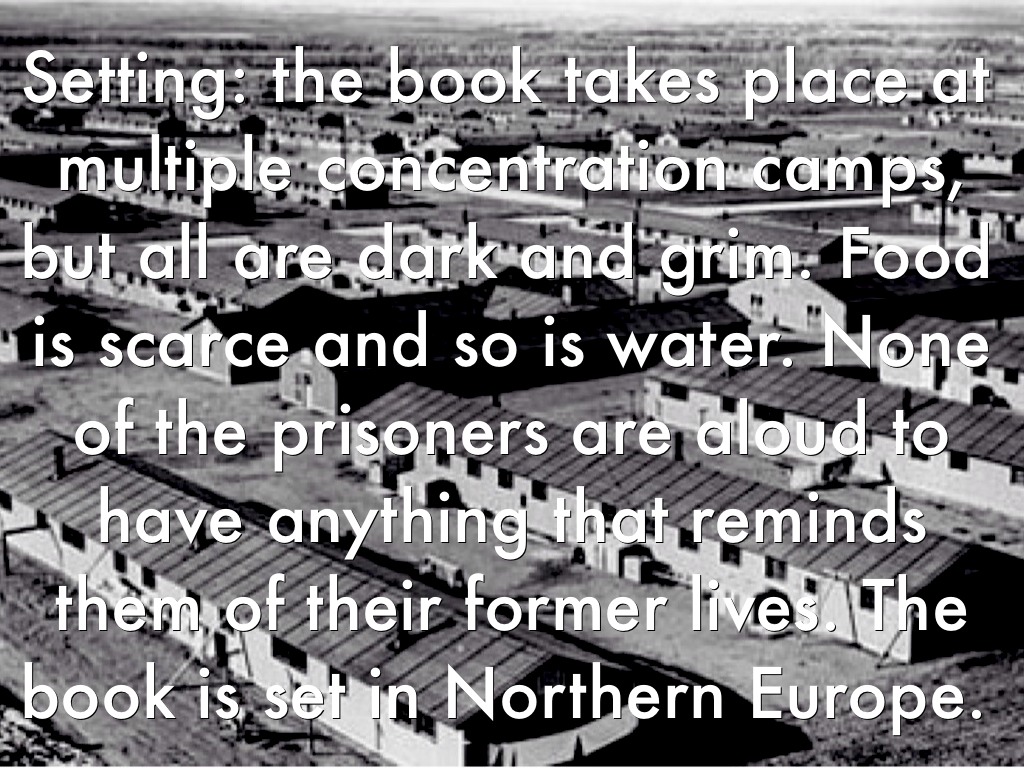 Setting: the book takes place at multiple concentration camps, but all are dark and grim. Food is scarce and so is water. None of the prisoners are aloud to have anything that reminds them of their former lives. The book is set in Northern Europe.