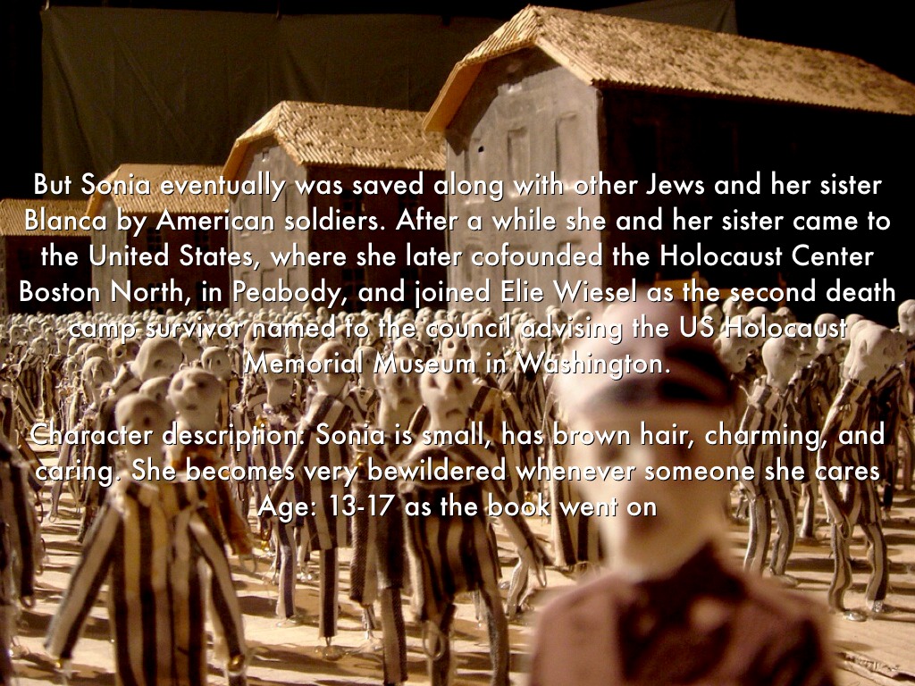 Sonia experienced being imprisoned in 5 separate concentration camps through out the book. The nazis moved her and the other Jews to different camps because the allies were closing in. Sonia had to experience the holocaust as a young girl. But miraculously she survived better then some around her. Most of Sonia's friends in the holocaust parishes along with others.