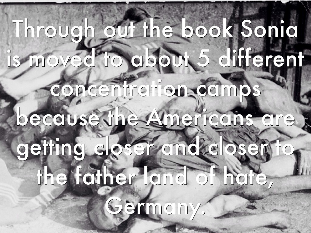 Through out the book Sonia is moved to about 5 different concentration camps because the Americans are getting closer and closer to the father land of hate, Germany.