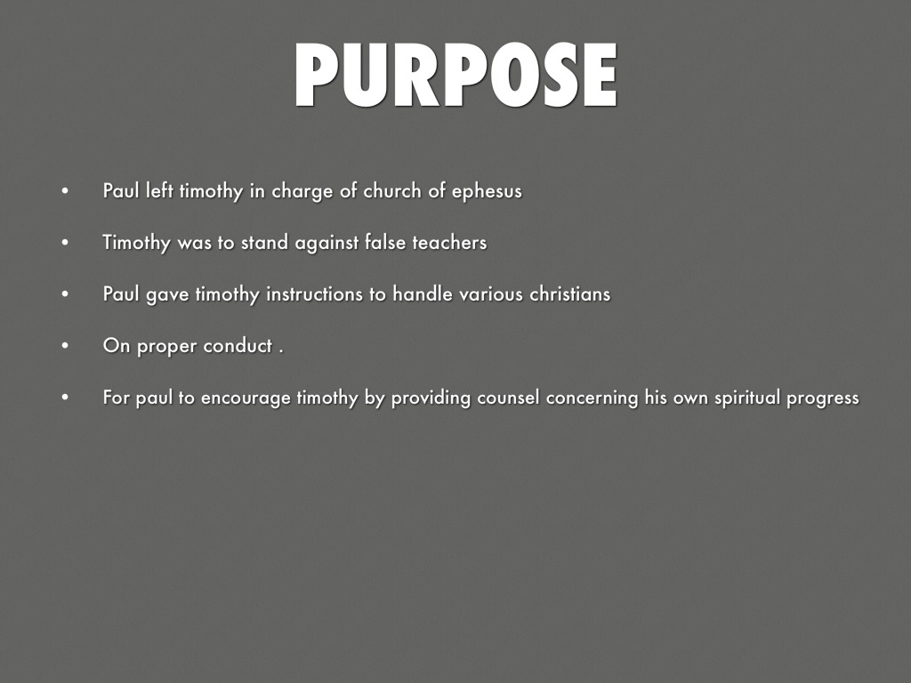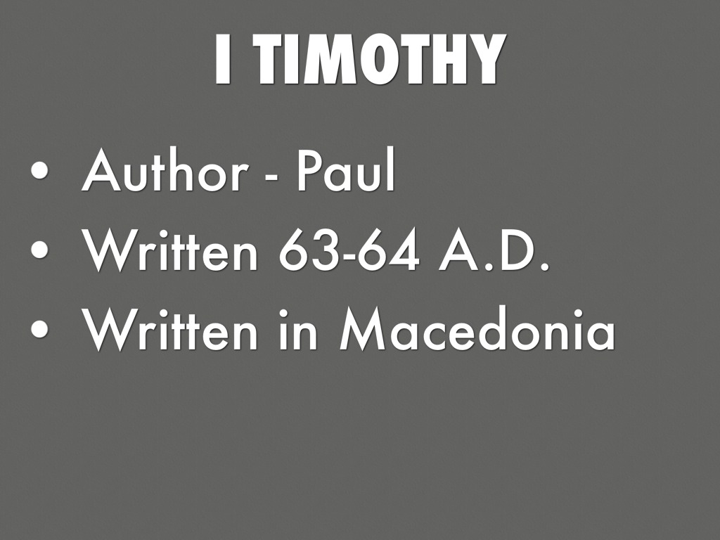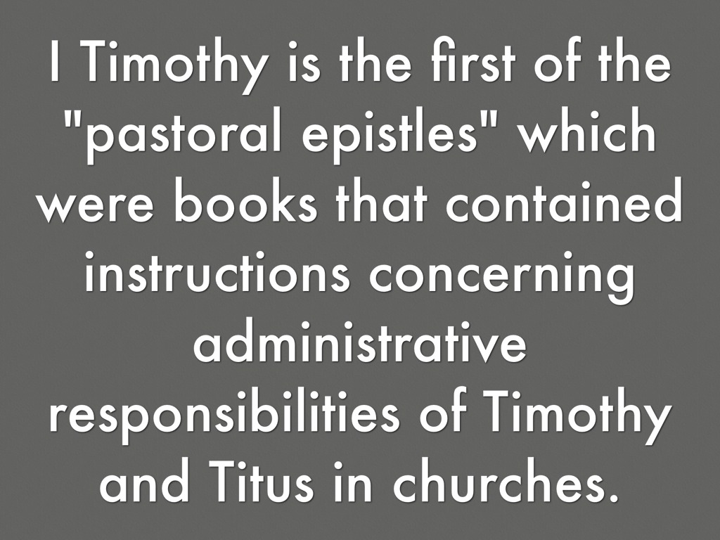I Timothy is the first of the "pastoral epistles" which were books that contained instructions concerning administrative responsibilities of Timothy and Titus in churches.
