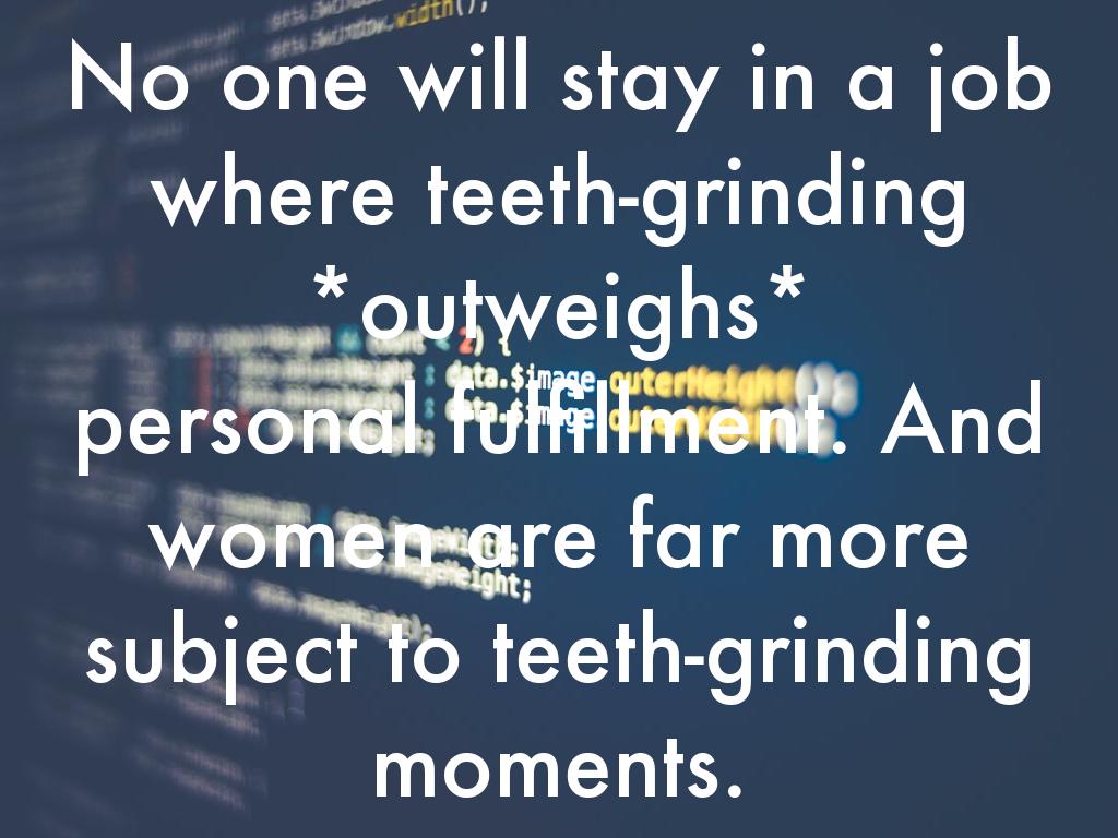 Because for women it's always personal. Coworkers take failure personally, and coworkers GET personal with women in ways that are totally inappropriate for work: comments on their appearance, on their dress, on their personality. A friend of mine was waiting for a female lead engineer to call in, and the owner of my friend's company said, “Do you know she rides a motorcycle?. She is so large I bet she just swallows it up when she sits on it.” My friend ground her teeth.