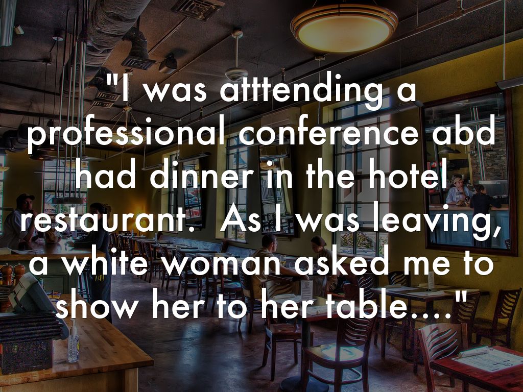 "I was atttending a professional conference abd had dinner in the hotel restaurant. As I was leaving, a white woman asked me to show her to her table...."