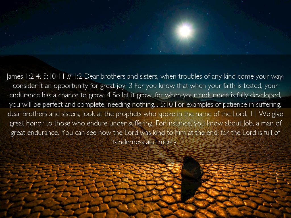 James 1:2-4, 5:10-11 // 1:2 Dear brothers and sisters, when troubles of any kind come your way, consider it an opportunity for great joy. 3 For you know that when your faith is tested, your endurance has a chance to grow. 4 So let it grow, for when your endurance is fully developed, you will be perfect and complete, needing nothing... 5:10 For examples of patience in suffering, dear brothers and sisters, look at the prophets who spoke in the name of the Lord. 11 We give great honor to those who endure under suffering. For instance, you know about Job, a man of great endurance. You can see how the Lord was kind to him at the end, for the Lord is full of tenderness and mercy.