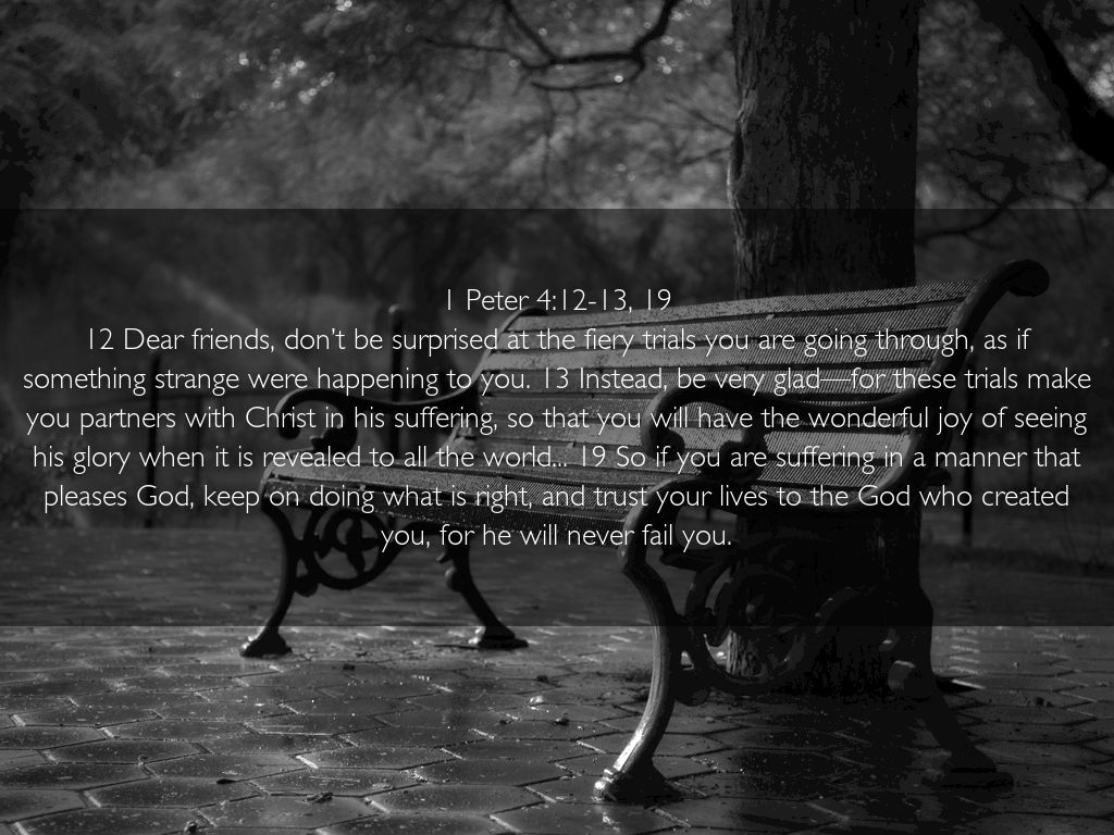 1 Peter 4:12-13, 19 12 Dear friends, don’t be surprised at the fiery trials you are going through, as if something strange were happening to you. 13 Instead, be very glad—for these trials make you partners with Christ in his suffering, so that you will have the wonderful joy of seeing his glory when it is revealed to all the world... 19 So if you are suffering in a manner that pleases God, keep on doing what is right, and trust your lives to the God who created you, for he will never fail you.